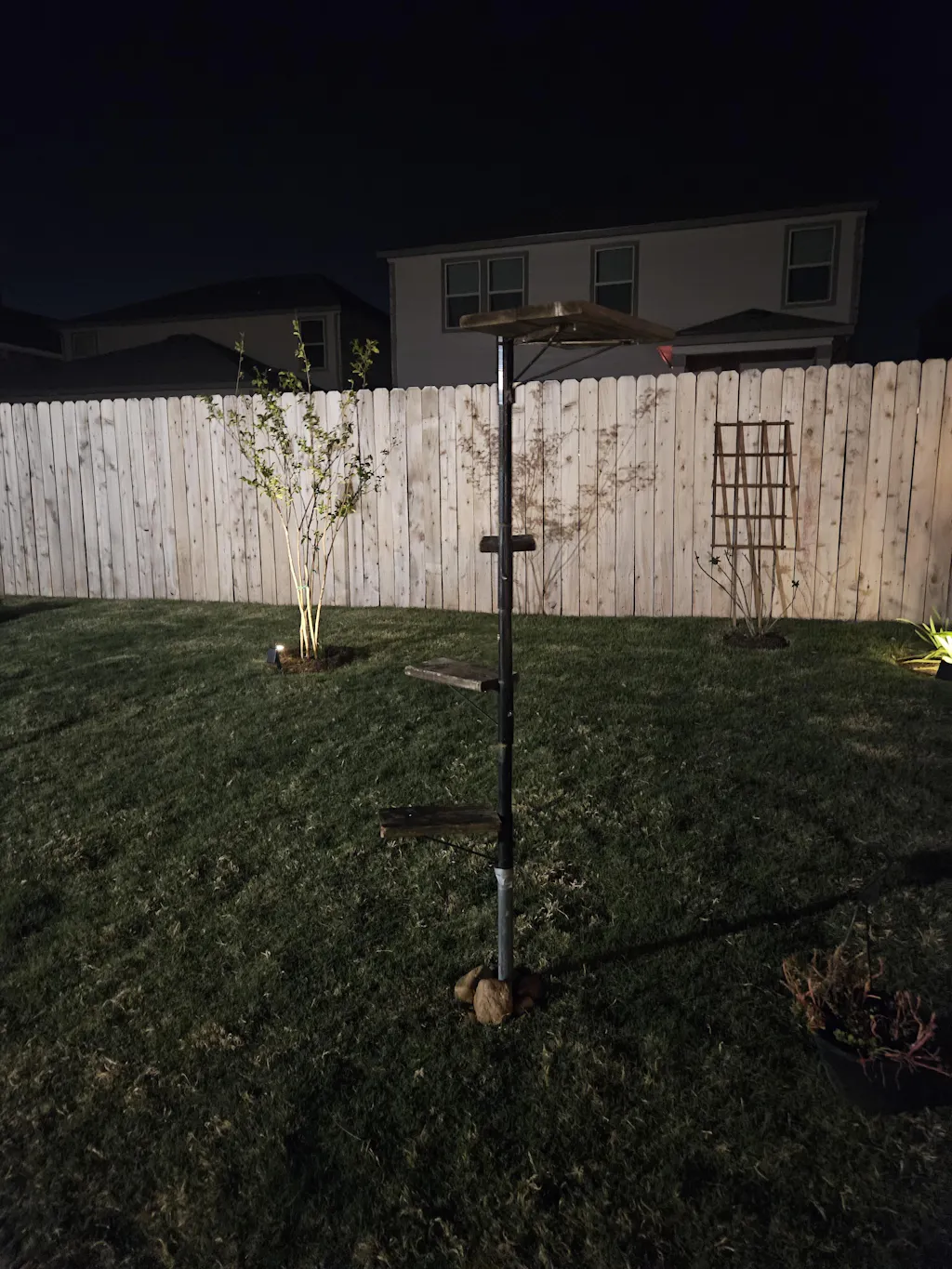 The base is incredibly solid but there is still a bit of flex in the post due to the nature of the hollow metal tubes used. I may need to dampen the flex a bit by connecting it to a nearby arbor with wire rope or something similar, but it all depends on what our feline family decides, right? We previously accomplished full dampening using a length of cheap vinyl clothsline cord.