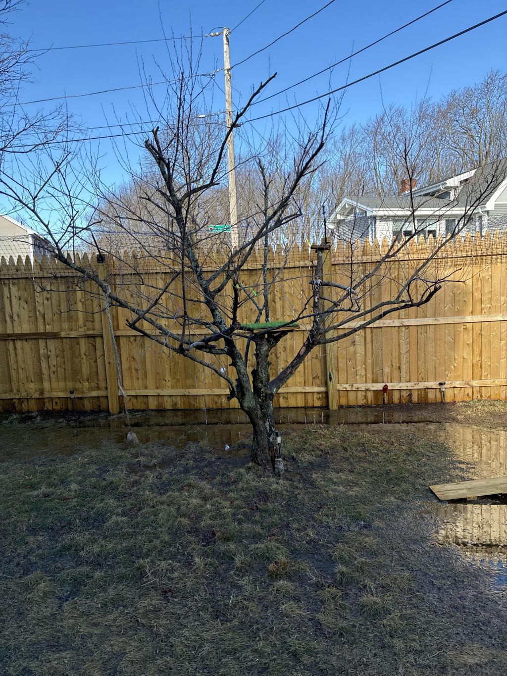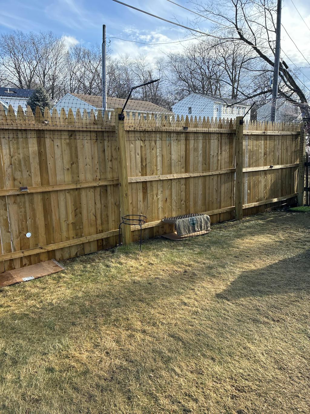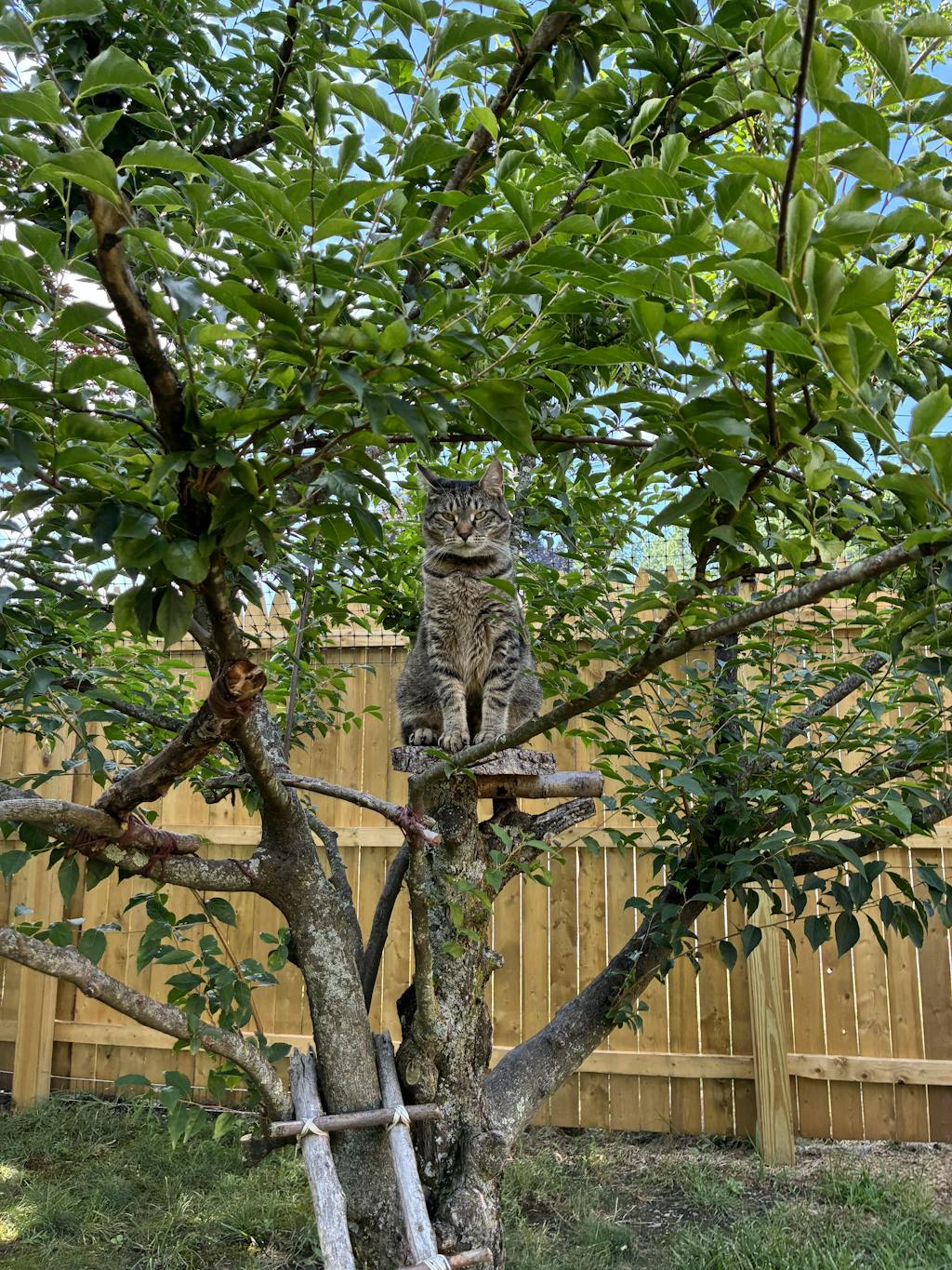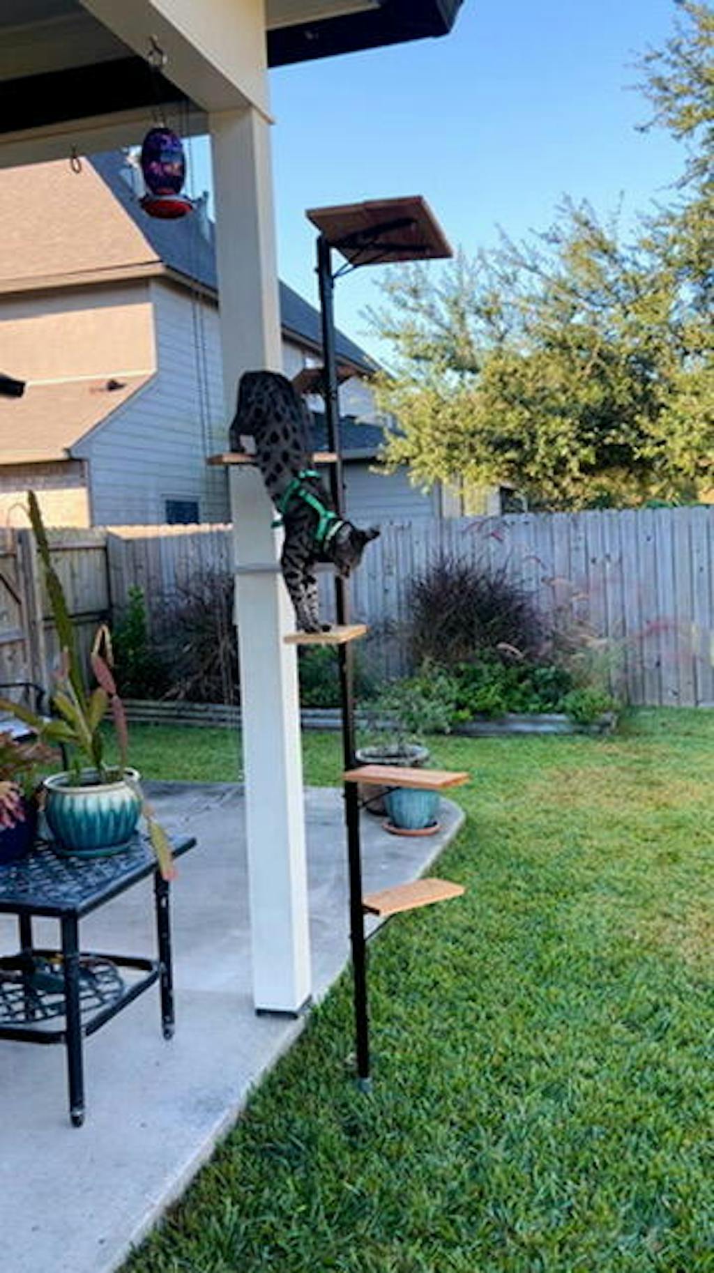 Assembly was mostly straightforward, though the holes on the platform boards didn’t line up with the bracket at first. I contacted Purrfect Fence Support on a Saturday and got a response by Tuesday letting me know they were sending replacement cedar boards. To my surprise, they arrived already attached to a new bracket—excellent customer service! The picture with the pole tied to the patio post is before securing the pole with the self drilling / tapping screws.